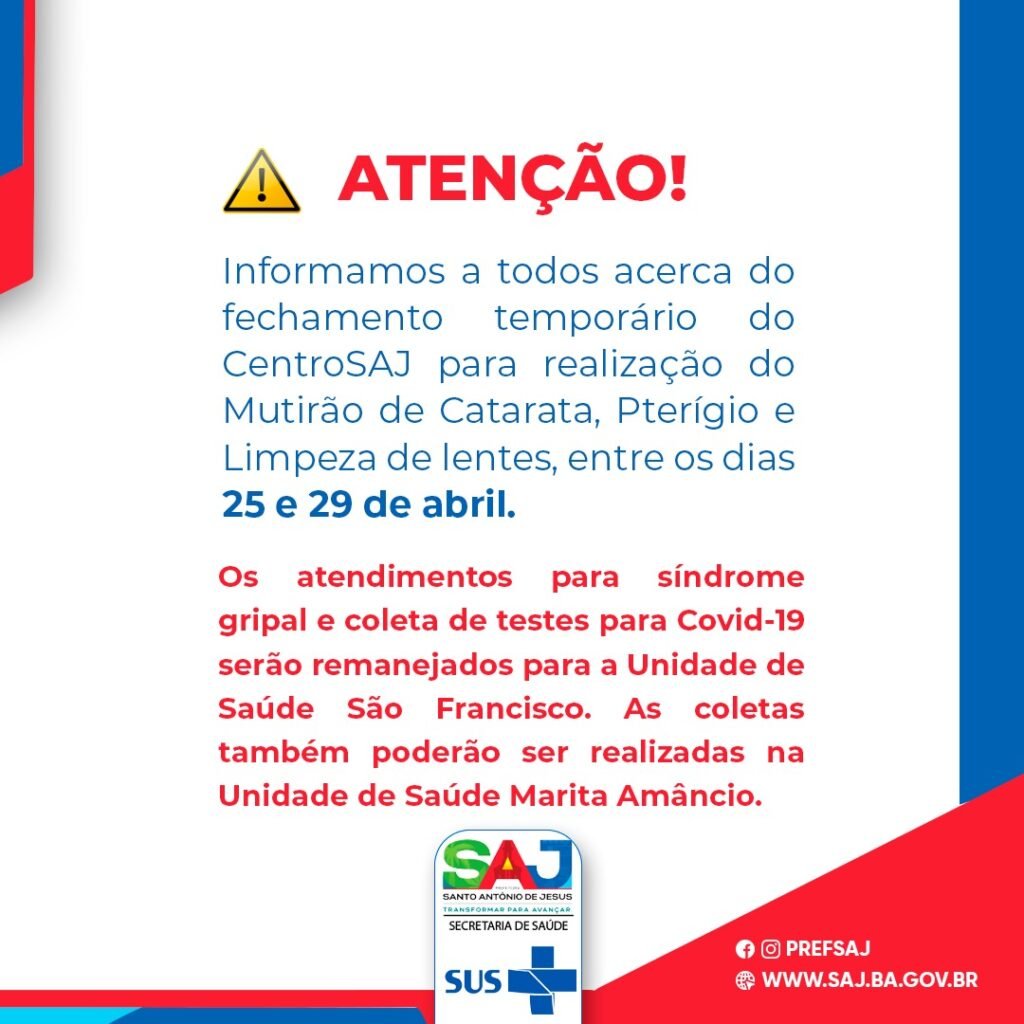 Fechamento acontecerá entre os dias 25 e 29 de abril A Prefeitura Municipal de Santo Antônio de Jesus, através da Secretaria Municipal de Saúde (SMS), informa a população acerca do fechamento, temporário, da Unidade de Saúde CentroSAJ, para realização do Mutirão de Catarata, Pterígio e limpeza de lente. O fechamento acontecerá entre a quinta-feira (25) […]