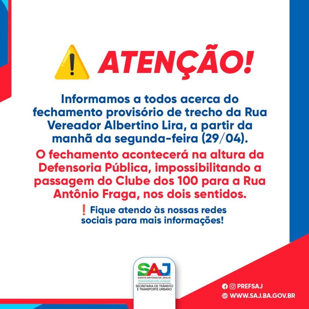 Interdição provisória se dará a partir da segunda-feira (29) A Prefeitura Municipal de Santo Antônio de Jesus, através das Secretarias de Infraestrutura (SEINFRA) e Trânsito e Transporte (SMTT), informa à população acerca do fechamento, provisório, de trecho da Rua Vereador Albertino Lira. O fechamento, que será iniciado a partir da manhã da segunda-feira (29), ocorrerá […]