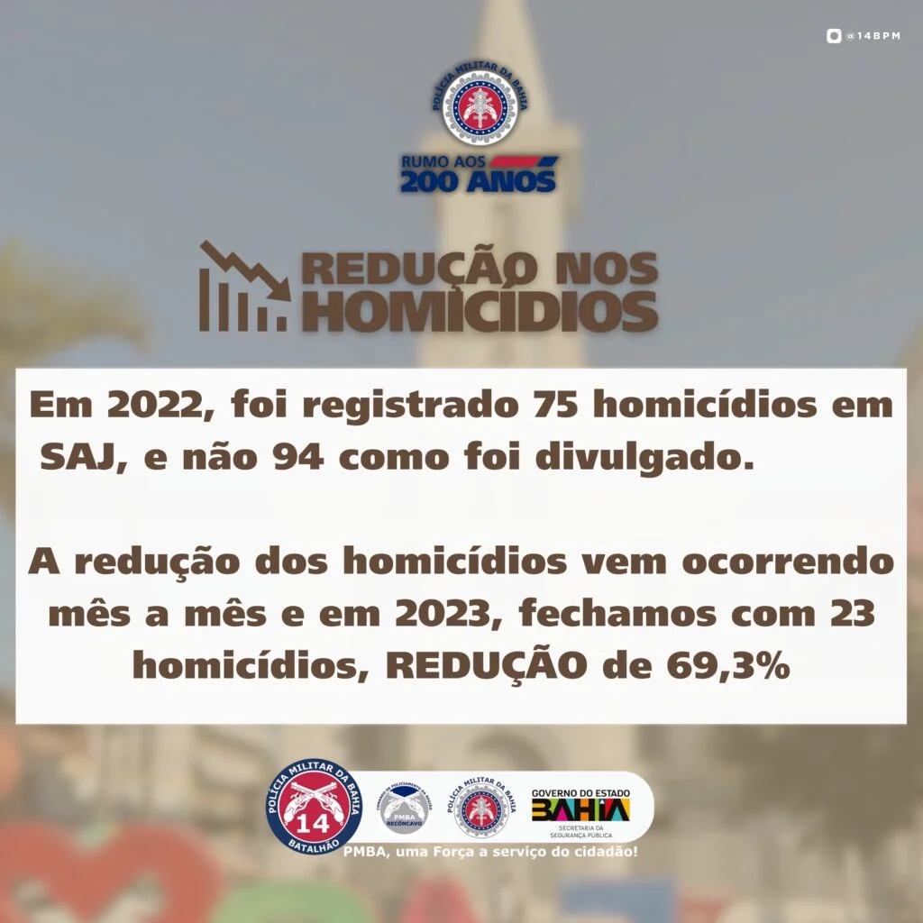 Divulgação de dados equivocados. Em 2022, foram registrados 75 homicídios em SAJ, e não 94 como foi divulgado. A redução dos homicídios vem ocorrendo mês a mês e em 2023, fechamos com 23 homicídios, REDUÇÃO de 69,3% Com dados atualizados, Santo Antônio de Jesus, hoje, ao contrário, não é a cidade mais violenta do País! […]