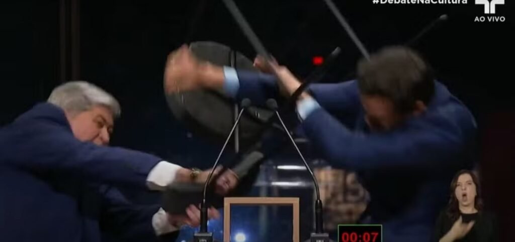 Datena agride Pablo Marçal com cadeirada durante debate em São Paulo
