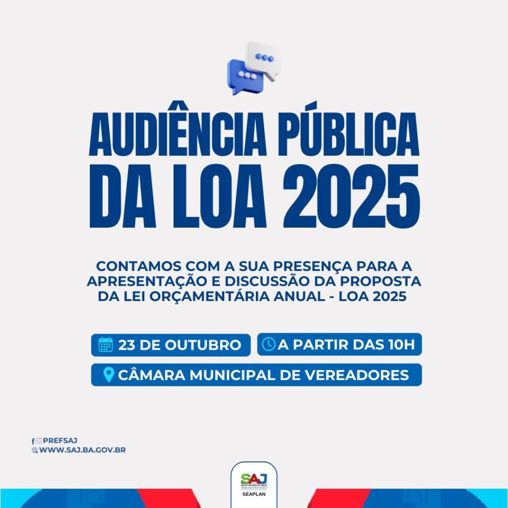 Pauta será a apresentação e discussão da Lei Orçamentária Anual – LOA 2025 Prefeitura Municipal de Santo Antônio de Jesus, através da Secretaria Administração e Planejamento (SEAPLAN), informa à população que está realizará, na quarta-feira dia 23 de outubro, uma Audiência Pública, para apresentação e discussão da proposta da LEI ORÇAMENTÁRIA ANUAL – LOA 2025. […]
