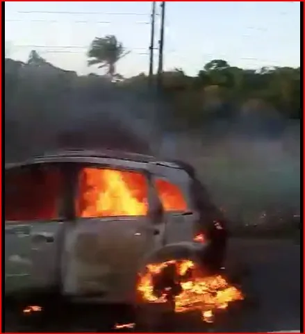 Automóvel é consumido pelas chamas na BA-001, próximo a Tairu