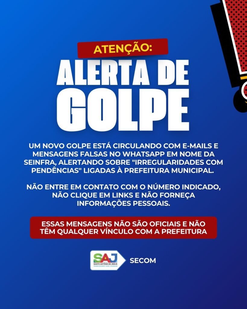 Poder executivo municipal solicita que munícipes redobrem a atenção A Prefeitura Municipal de Santo Antônio de Jesus tomou conhecimento sobre uma nova tentativa de golpe, onde indivíduos, de forma criminosa, têm enviado e-mails e mensagens via WhatsApp falsas para os santoantonienses, utilizando o nome da Secretaria de Infraestrutura (SEINFRA). Os e-mails e mensagens fraudulentas afirmam […]