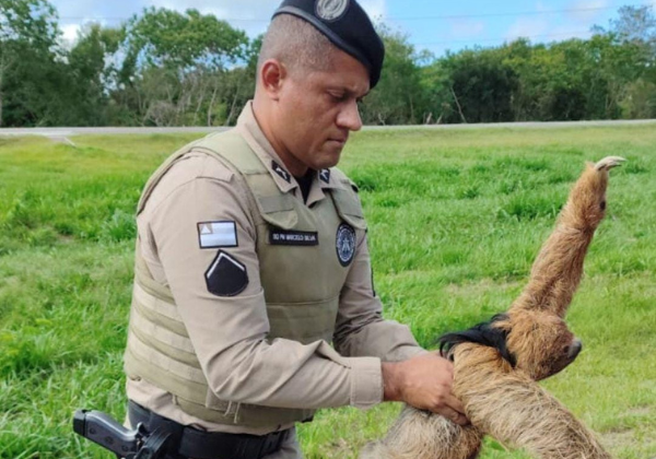 Polícia Militar resgata bicho-preguiça que tentava atravessar pista na BA-099