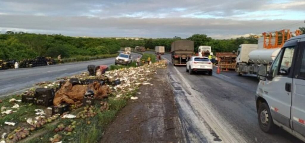 Caminhão de mangas tomba e provoca interdição parcial em BR na Bahia