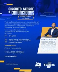 Evento exclusivo para profissionais de imprensa e comunicação será realizado no dia 13 de abril, com palestra do jornalista Vanderson Nascimento sobre jornalismo e comunicação com propósito Santo Antônio de Jesus recebe, na próxima segunda, 13 de abril, o Circuito Sebrae de Comunicadores, iniciativa voltada a profissionais de imprensa e