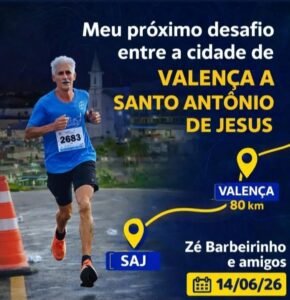 O atleta José Silva Sousa, conhecido como “José Barbeiro”, de 62 anos, se prepara para mais uma grande prova de resistência. No próximo dia 14 de junho de 2026, ele realizará seu 7º desafio pessoal, percorrendo aproximadamente 80 quilômetros no trajeto entre Valença e Santo Antônio de Jesus.