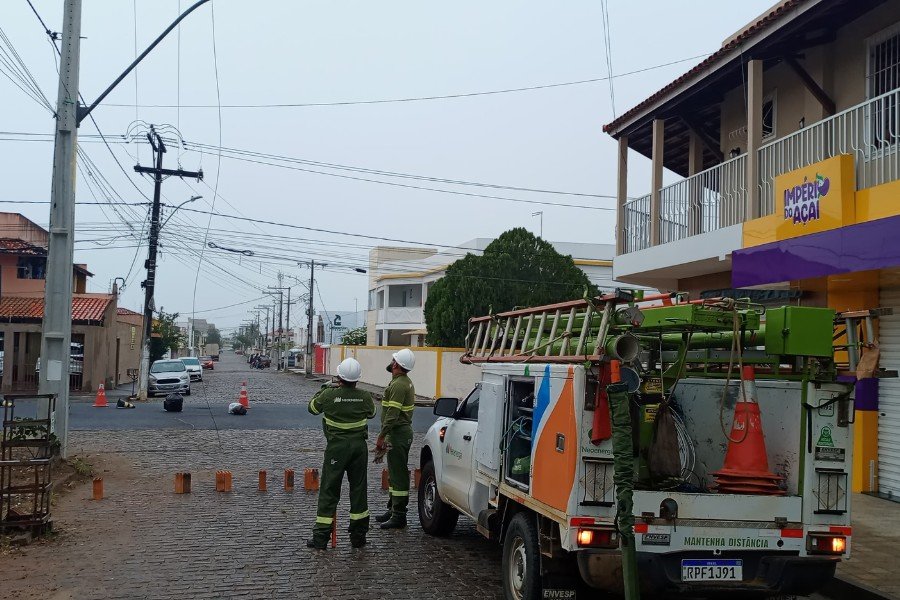 “Aqui foi a rede que ela veio ao solo, certo? Mas a gente já entrou em contato com a central. A rede já tá desenergizado e no momento a gente vai tirar o risco aqui, retomar com energia e depois efetuar o concerto”, explicou um funcionário da distribuidora que atuava no reparo.