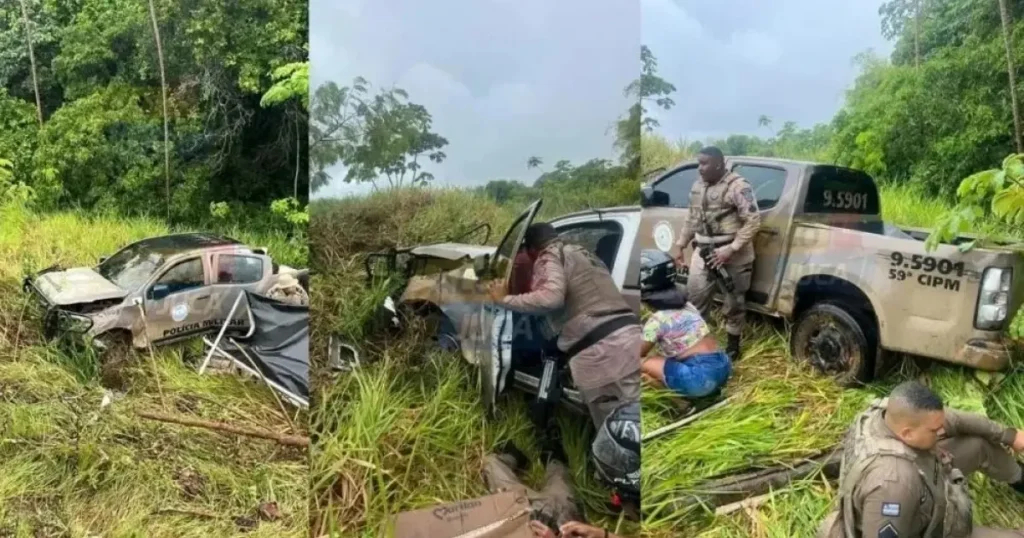 Viatura da PM capota durante perseguição em Guarajuba; um dos agentes sofreu fratura exposta