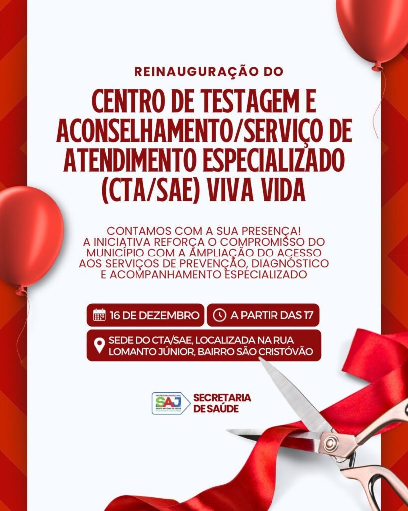 Evento marca reestruturação dos serviços especializados em prevenção e cuidado à saúde A Prefeitura Municipal de Santo Antônio de Jesus, por meio da Secretaria Municipal de Saúde (SMS), realizará no dia 16 de dezembro, a partir das 17h, a reinauguração do Centro de Testagem e Aconselhamento/Serviço de Atendimento Especializado (CTA/SAE) Viva Vida. O evento acontecerá […]
