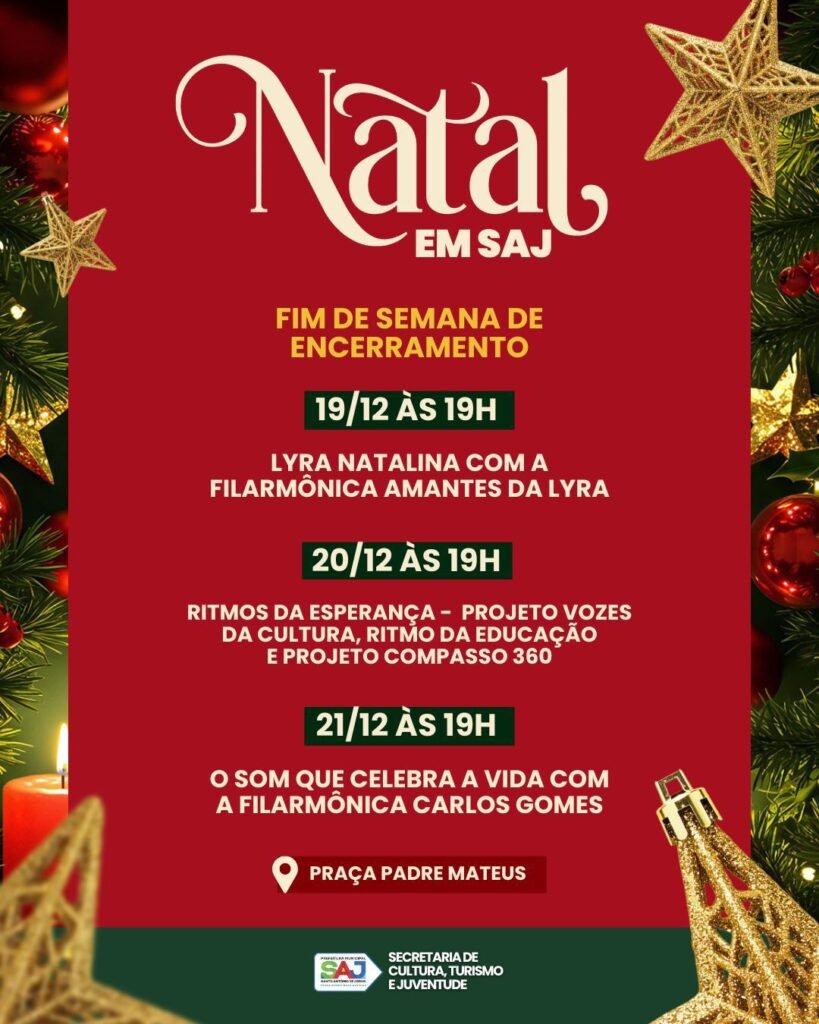 Shows e atrações especiais marcam os últimos dias do Natal na Praça Padre Mateus A Prefeitura Municipal de Santo Antônio de Jesus, por meio da Secretaria de Cultura, Turismo e Juventude (SCTJ), divulga a programação do fim de semana das festividades natalinas. No dia 19 de dezembro, às 19h, acontece a apresentação da Lyra Natalina […]