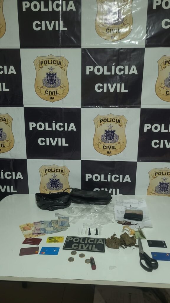 A policia Civil de Cruz das Almas, após levantamento de campo, com informações da ocorrência de comercialização de entorpecentes na rua Andaraí, no Itapicuru, empreendeu diligência na localidade, através do Serviço de Investigação-SI, da Delegacia Territorial de Cruz das Almas, oportunidade em que, após capana e com trabalho de inteligência policial, flagrantiou e abordou pessoa que estava praticando a mercancia ilegal de entorpecentes, o qual não esborçou reação e foi imobilizado, sendo apreendido com o mesmo uma polchete preta contendo no interior vasta quantidade de maconha em tablete in natura e cocaína , além de cartões bancários, diversos ependorfs vazio, sacos para embalar droga, 01 tesoura, 74 (setenta e quatro reais) em papel moeda miúdo.