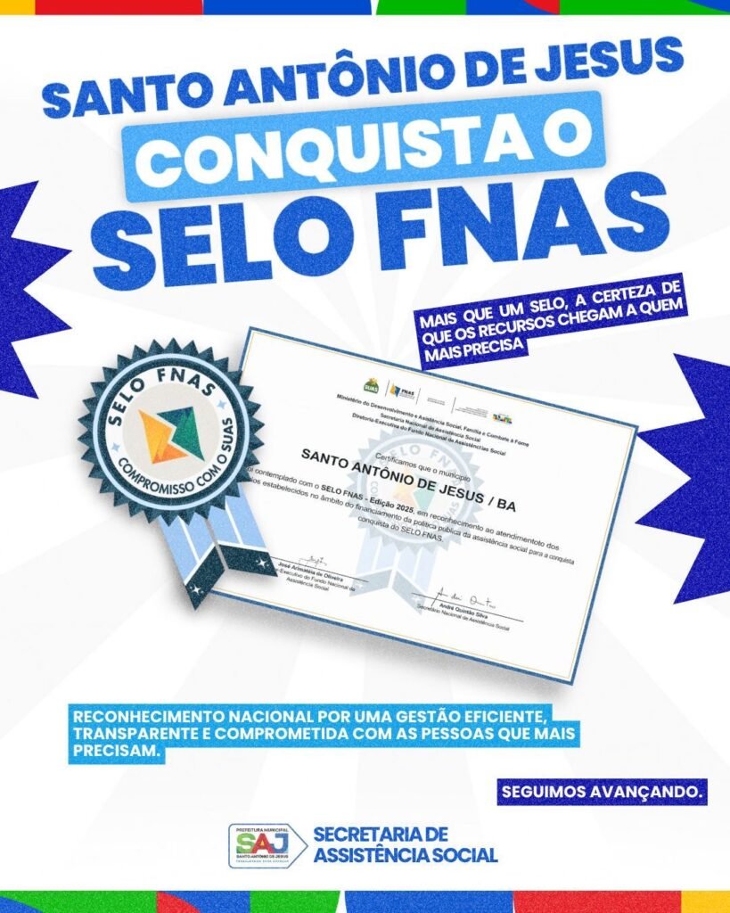 A Prefeitura Municipal de Santo Antônio de Jesus, através da Secretaria Municipal de Assistência Social (SMAS), celebra a conquista do Selo FNAS, reconhecimento que valida a excelência na gestão financeira e orçamentária da Assistência Social. Mais do que um título, o selo confirma o compromisso do município com a boa aplicação dos recursos públicos, garantindo que eles cheguem, de forma responsável e eficaz, às pessoas que mais precisam.