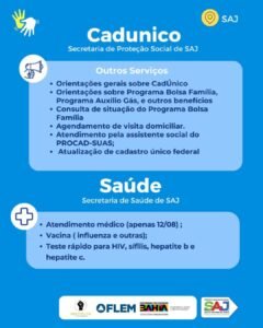 Durante os dois dias, a população terá acesso a diversos serviços e orientações. A Secretaria de Assistência Social oferecerá atendimentos relacionados ao CadÚnico, Programa Bolsa Família, Programa Auxílio Gás e outros benefícios, além de atualização cadastral e atendimento com assistente social do PROCAD-SUAS. Já a Secretaria de Saúde disponibilizará vacinação (incluindo influenza), testes rápidos para HIV, sífilis, hepatite B e C, e atendimento médico no dia 12. A gestão municipal reforça o compromisso com a promoção dos direitos sociais e o cuidado com a população, aproximando os serviços públicos das comunidades e garantindo acesso facilitado a políticas essenciais para o bem-estar e a cidadania.