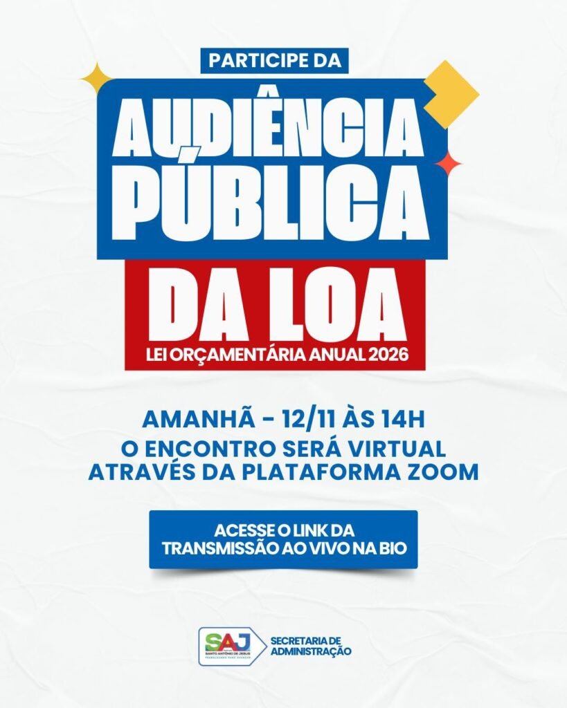 A Prefeitura Municipal de Santo Antônio de Jesus, por meio da Secretaria de Administração (SEAD), realizará na sexta-feira (14), às 9h, uma audiência pública para apresentação e discussão da Proposta da Lei Orçamentária Anual (LOA) 2026. A iniciativa atende aos princípios da transparência e publicidade que regem a administração pública, conforme previsto no artigo 48 e parágrafo único da Lei Complementar nº 101/2000.