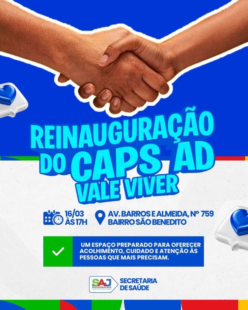 A Prefeitura Municipal de Santo Antônio de Jesus, por meio da Secretaria Municipal de Saúde (SMS), realizará no dia 16 de março, às 17h, a reinauguração do CAPS AD Vale Viver, localizado na Avenida Barros e Almeida, bairro São Benedito. O equipamento foi requalificado para oferecer um ambiente mais humanizado, estruturado e preparado para acolher pessoas em situação de sofrimento decorrente do uso de álcool e outras drogas.