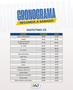 O serviço de coleta no turno da manhã acontece de segunda a sábado nos seguintes horários: Alto do Sobradinho das 08:00 às 13:00; Andaiá das 06:40 às 09:00; Av. Barros Almeida (+Vila Martins) das 07:00 às 08:00; Av. ACM das 06:30 às 07:45; Av. Juraci Magalhães das 06:30 às 08:00 e 10:00 às 12:00; Barro Vermelho das 11:00 às 15:00; Bela Vista das 08:00 às 10:30; Cajueiro das 09:00 às 11:30; Calabar das 08:00 às 10:00; Casco das 11:00 às 14:30; Distrito Industrial das 11:00 às 15:00; Irmã Dulce (Mutum) das 08:00 às 11:30; Jardim Brasil das 09:00 às 12:00; Lot. Recanto do Andaiá das 12:00 às 14:00; Maria Preta das 08:00 às 13:00; Nossa Senhora das Graças das 07:00 às 10:00; Quitandinha das 08:00 às 10:30; Rádio Clube das 08:30 às 12:00; Recanto dos Prazeres das 09:00 às 10:30; Rua da Alegria das 12:00 às 14:00; Rua Vereador João Silva (Rua da Linha) das 06:30 às 08:00 e 10:00 às 12:00; Sales das 11:00 às 15:00; Salgadeira das 09:30 às 11:30; Santa Rita (Maria Preta) das 08:00 às 13:00; São Benedito das 08:30 às 12:00; São Paulo das 11:00 às 13:30; Sobradinho das 08:00 às 13:30; Urbis I das 08:30 às 12:00; Urbis II + Salomão das 11:00 às 15:00 e Urbis IV das 06:30 às 10:00.