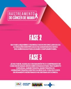 Na Fase II, mulheres com resultados inconclusivos ou alterações identificadas na mamografia serão encaminhadas para exames complementares. Já na Fase III, aquelas com diagnóstico confirmado de câncer de mama serão direcionadas para tratamento (cirurgia, quimioterapia, radioterapia ou hormonioterapia) dentro da Rede SUS, com os casos devidamente registrados no Sistema Lista Única.