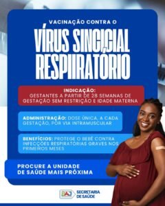 A Prefeitura Municipal de Santo Antônio de Jesus, por meio da Secretaria Municipal de Saúde (SMS), informa à população sobre a disponibilização da vacina contra o Vírus Sincicial Respiratório (VSR) para todas as gestantes a partir de 28 semanas.