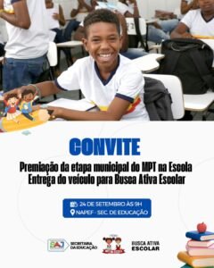 A Prefeitura Municipal de Santo Antônio de Jesus, por meio da Secretaria Municipal de Educação, convida os veículos de comunicação para a cerimônia de premiação da etapa municipal do Projeto MPT na Escola, que será realizada na quarta-feira (24), às 9h, no NAPEF (Secretaria de Educação).